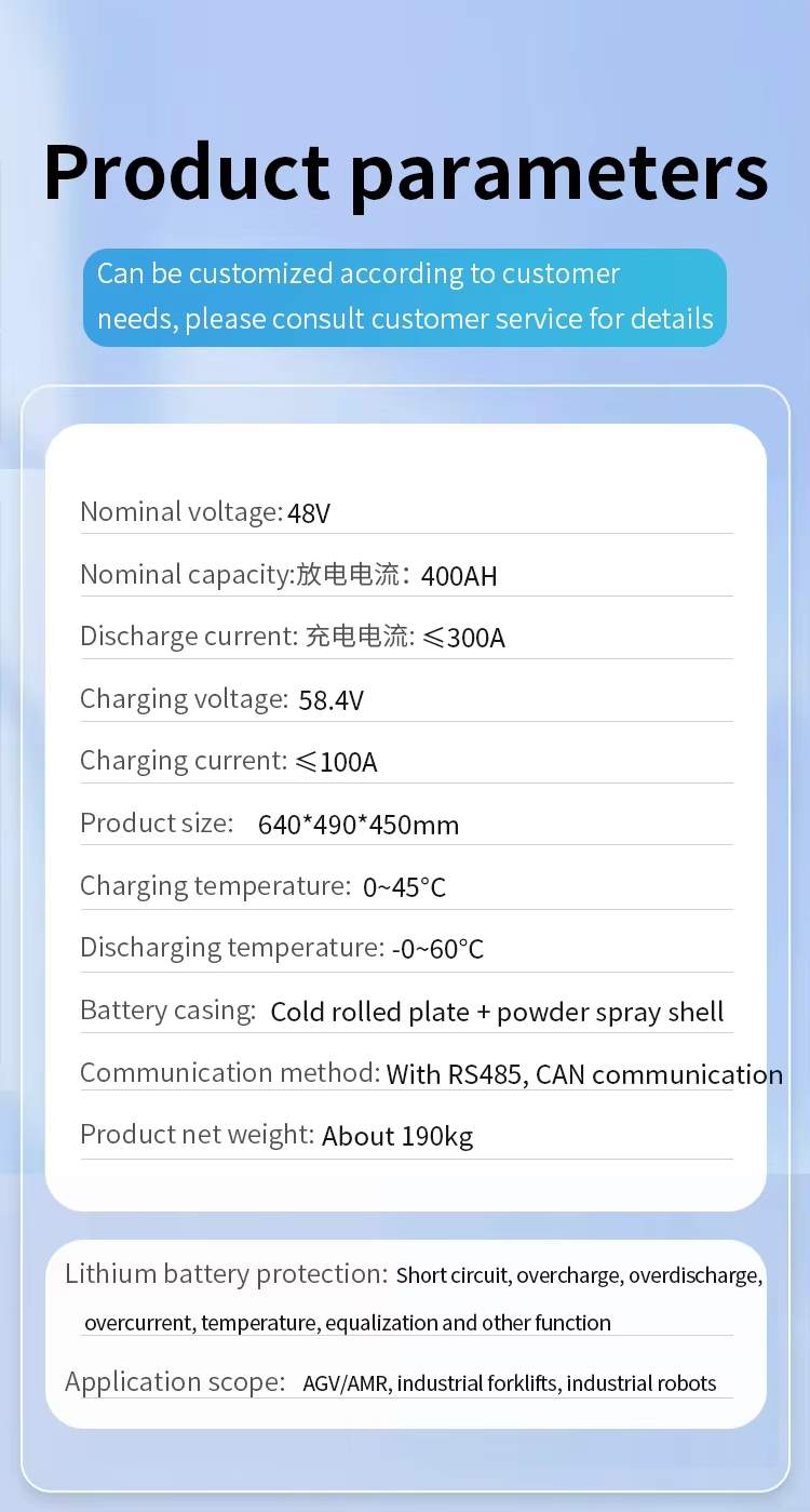 Introducing our deep cycle 48V 400Ah lithium iron phosphate (LiFePO4) battery, specifically designed for automated guided vehicles (AGVs).